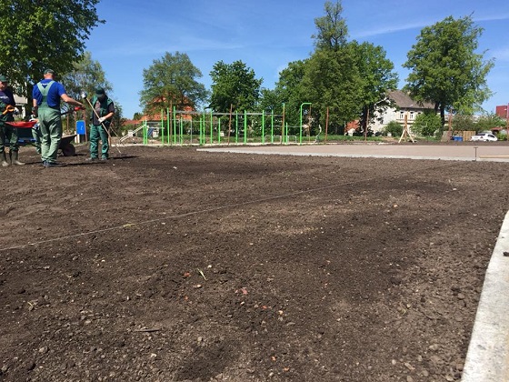 Firma Ogrody s.c ze Słupska, podwykonawca firmy Krężel (główny wykonawca) przystąpiła do przygotowania terenu pod trawę z rolki.
