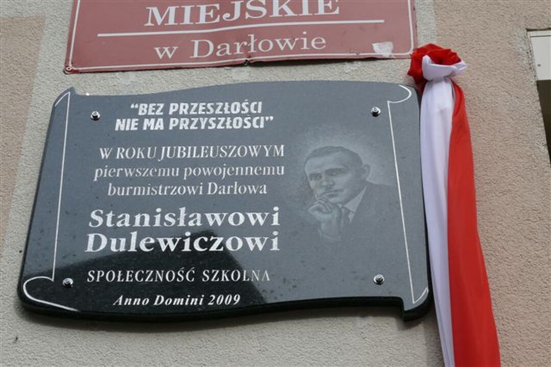 W piątek 2 października 2009 r. odbyła się uroczystość poświęcona 10. rocznicy utworzenia i funkcjonowania Miejskiego Gimnazjum im. Stanisława Dulewicza w Darłowie. Uroczystość rozpoczęła się Mszą Św. w Kościele Mariackim. Następnie burmistrz miasta Darłowa Arkadiusz Klimowicz razem z wnukiem pierwszego burmistrza Darłowa i patrona szkoły Stanisława Dulewicza odsłonili ufundowaną przez samorząd i umocowaną przy wejściu do szkoły tablicę pamiątkową. Na niej umieszczono słowa, które często powtarzał patron szkoły, również nauczyciel gimnazjalny: „Bez przeszłości niema przyszłości". Po poświęceniu tablicy przez proboszcza parafii M.B. Częstochowskiej dalszy ciąg uroczystości przebiegał w murach Gimnazjum.