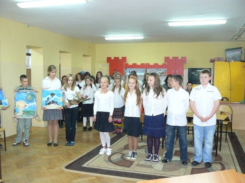 Prowadzący - podkreślając, iż twórcze myślenie, aktywna postawa, rzetelna wiedza otwierają przed uczniami szerokie perspektywy na przyszłość - zachęcali do podejmowania różnorodnych akcji i przedsięwzięć prowadzonych w naszej szkole, takich jak: Uczeń nie wielbłąd, czyli odchudzamy szkolne plecaki, zbiórka makulatury, Oszczędzamy z SKO, zbiórka baterii, czy akcja Ratujmy kasztanowce w naszym mieście!
