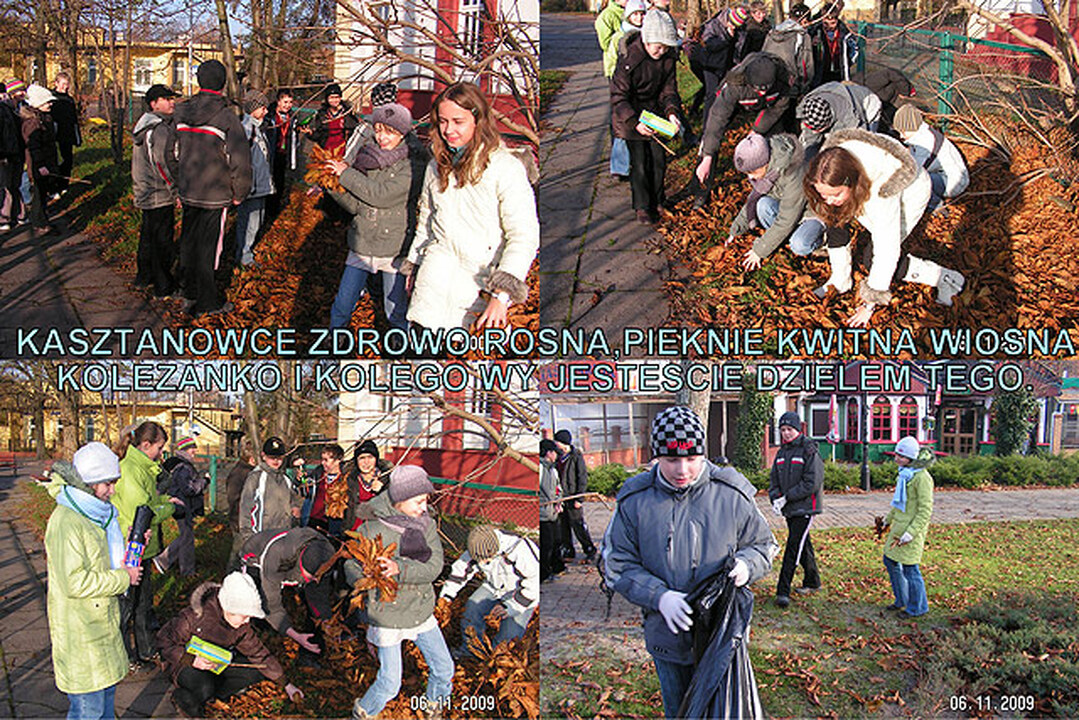Klasa V z Zespołu Szkół w Darłówku już po raz drugi przystąpiła do akcji ratowania kasztanowców. Uczniowie grabili liście, napełniali worki i przynosili je do szkoły.