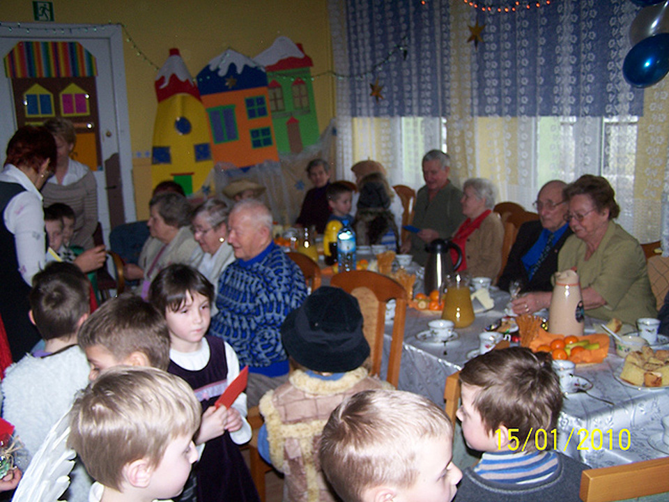 W Przedszkolu Nr 2 im. Janiny Porazińskiej w Darłowie dnia 15 stycznia 2010 roku o godz. 10.00 zaszczycili nas swoją obecnością zaproszeni goście: członkowie Stowarzyszenia Pionierów Ziemi Darłowskiej, Klubu Seniora ,,Nadzieja Złotego Wieku", Związku Emerytów i Rencistów oraz byłych pracowników naszego przedszkola. Dzieci z grup V, VI i VII przygotowane przez nauczycielki zaprezentowały krótki program artystyczny, recytowały treści z wigilijnej opowieści, śpiewały kolędy i pastorałki. Goście byli wzruszeni i zauroczeni występem, scenografią i atmosferą. Na zakończenie przedszkolaki zaśpiewały piosenkę o tym, jak to babcia z dziadkiem byli mali. Na pamiątkę tego spotkania dzieci wręczyły seniorom upominki. W imieniu przybyłych gości wystąpił Pan Eugeniusz Wójcik. Podziękował przedszkolakom za umiejętności aktorskie, organizatorom za możliwość uczestniczenia w tym pięknym wydarzeniu. Na ręce Pani dyrektor Barbary Zalewskiej złożone zostały kwiaty, dzieci otrzymały owoce i słodycze.