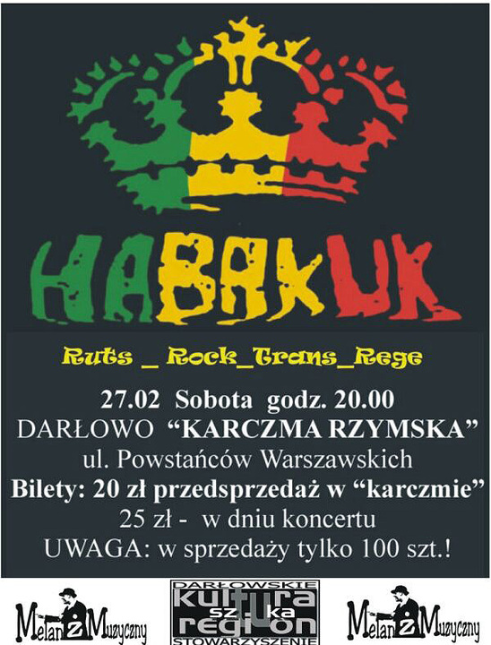 W sobotę 27 lutego 2010 roku w ramach Melanżu Muzycznego w Karczmie Rzymskiej odbędzie się koncert zespołu Habakuk, który rozpocznie się o godzinie 20:00. Ilość biletów na to muzyczne wydarzenie jest ograniczona (tylko 100 szt.!). W przedsprzedaży można je nabyć w cenie 20 zł w 'karczmie' lub w dniu i miejscu koncertu w cenie 25 zł.
