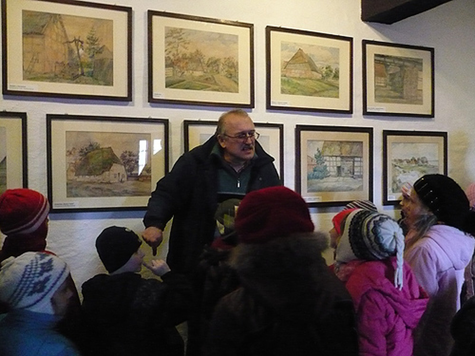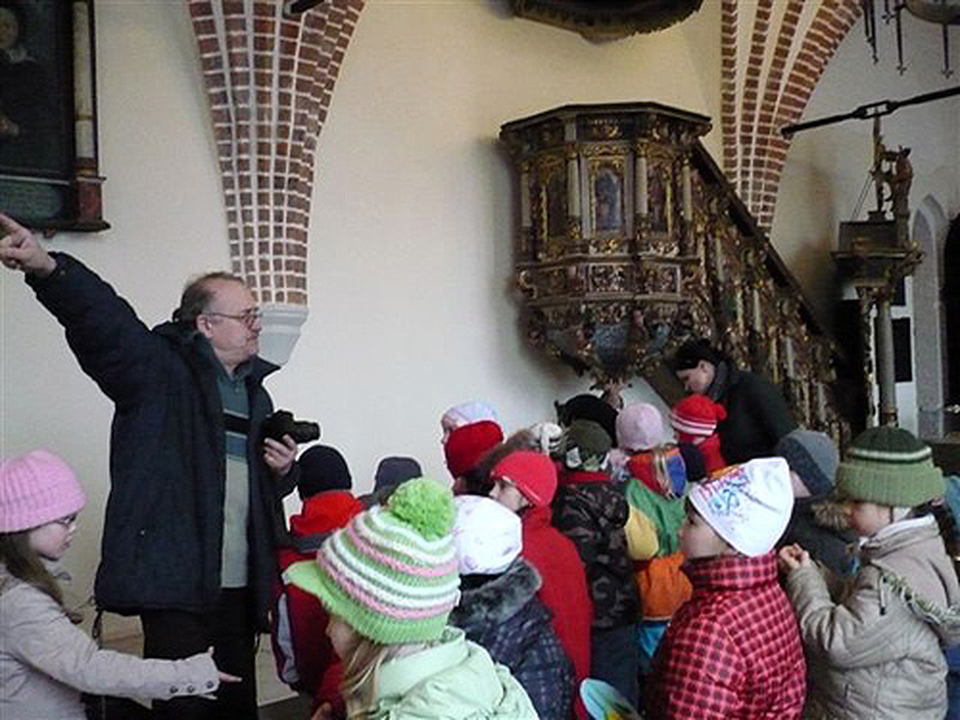 Dzieci poznały już najważniejsze „darłowskie perełki" wymieniane medialnie we wszelkich materiałach promocyjnych naszego miasta. Ale pewnego dnia, tj. 19 marca 2010 r., za namową i uzgodnieniach pewnego przedszkolaka stawiliśmy się (grupa VIII i IX z Przedszkola Nr 2 wraz z wychowawcami: M. Knapińską i M. Werner ) do Zamku Książąt Pomorskich w Darłowie na spotkanie z jego wujkiem. Nauczyciele określają taką formę - spotkania z ciekawymi ludźmi. W murach starego zamku powitał wszystkich Konstanty Kontowski, historyk sztuki, z zamiłowania malarz i rysownik, autor wielu obrazów i rysunków o Darłowie. Pan Kontowski oprowadzając przedszkolaków po różnych zakątkach i salach zamkowych zwracał uwagę na przedmioty zgromadzone w poszczególnych salach. Dostępnym dla dziecka językiem opowiadał o byłych mieszkańcach darłowskiego zamku, jego historii i pięknych eksponatach muzealnych. Wzbogacił swoją opowieść o niektóre fakty z życia w naszym małym miasteczku. Spotkanie z „ciekawym" człowiekiem okazało się miłe i interesujące dla uczestników. Zapewne Zamek Książąt Pomorskich utknie w pamięci każdego dziecka, będzie przedmiotem fantastycznych przemyśleń i twórczych pomysłów. Dziecko z natury lubi przyglądać się wszystkiemu. Dlatego percepcja sztuki w atmosferze doznań emocjonalno estetycznych pozwala na rozbudzanie drzemiących w dziecku potrzeb poznawczych. Dzieci miały możliwość obcowania z dziełami sztuki swojego miasta, uzyskania odpowiedzi na nurtujące ich pytania od swojej pani z przedszkola oraz Pana Kontowskiego, więc cel został osiągnięty. Dzieci zaśpiewały piosenkę „Darłowo", której słowa ułożyła M. Knapińska, a na zakończenie zrobiono wspólną fotografię.