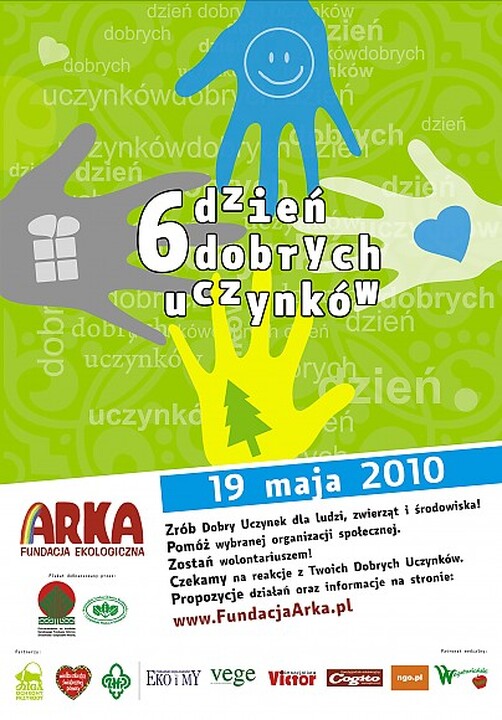 Fundacja ekologiczna ARKA wraz z partnerami organizuje 19 maja VI Dzień Dobrych Uczynków. Ideą jest to, aby wszyscy, zwłaszcza najmłodsi, uświadomili sobie możliwość zrobienia czegoś dobrego dla ludzi, zwierząt i środowiska. W akcję pod hasłem „Dobre uczynki dla ludzi, zwierząt i środowiska" zaangażowanych jest kilkaset szkół i organizacji z całej Polski, w tym również z Darłowa. Organizują m.in. zbiórki zabawek, książek i upominków dla domów dziecka, domów pomocy społecznej, świetlic środowiskowych. I Ty bezinteresownie zrób coś dobrego, pożytecznego czy miłego. Jak się włączyć? Wystarczy trochę posprzątać teren, posegregować zebrane odpady, posadzić drzewko lub kwiatek, nakarmić bezdomnego psa albo zabawić się w „Niewidzialną Rękę".