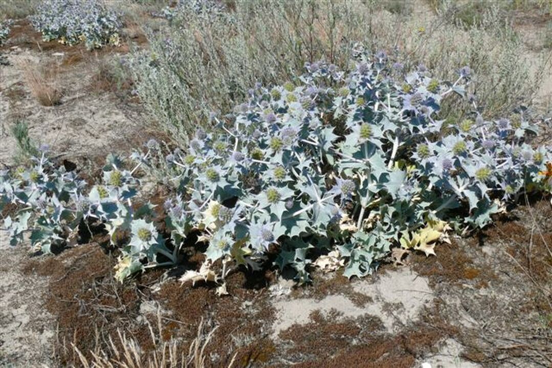 Ma mocną łodygę, o nasadzie nawet do 1 cm grubości, dzięki czemu dobrze znosi zasypywanie przez słonawy piasek. Liście rośliny są sztywne, twarde, ostrokolczaste, pokryte nalotem wosku, który zapobiega nadmiernej utracie wody. Nasiona są odporne nawet na kilkutygodniowe zalanie wodą morską. Jego pełzające pod ziemią kłącza, przez które jest zaopatrywany w wodę sięgają nawet do 4 m. Roślina światłolubna przystosowana jest do znoszenia suszy i wiatru. Ten zagrożony gatunek objęty jest w Polsce ścisłą ochroną gatunkową. Roślina kwitnie na kolor ametystowo-niebieski, w okresie od czerwca do września. Zapylana jest przez owady, a owoce rozsiewane są przez zwierzęta. W środowisku naturalnym rozmnaża się jednak głównie wegetatywnie. większość bowiem jej siewek ginie w pierwszym roku.