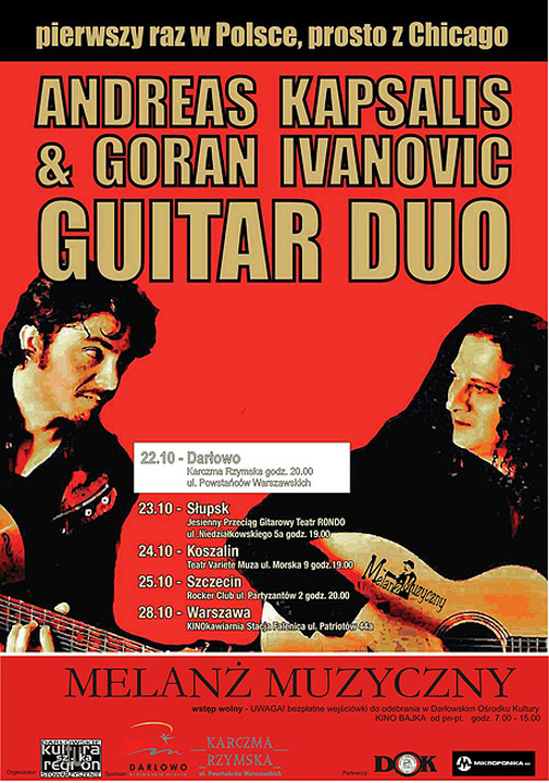 to mistrzowskie połączenie wirtuozerskiej gry na gitarze, wybitnych tematów muzycznych i dynamicznych rozwiązań rytmicznych. Hiszpańsko-fleksyjna gitara Kapsalisa rozwija niezbadane wcześniej style muzyczne i przekracza strukturalne granice muzyki pop. Doskonale pasuje do improwizacyjnego i precyzyjnego stylu gry Gorana Ivanovica - serbskiego gitarzysty światowej sławy. Połączenie brzmień mocnej, akustycznej gitary Andreasa Kapsalisa i ciepłej barwy gitary klasycznej Gorana Ivanovica gwarantuje niepowtarzalne emocje. Muzycy skłaniają się ku tradycji, lecz całkowicie pomijają konwencjonalne rozwiązania techniczne. Eksperymentują zarówno z muzyką klasyczną jak i rockową, jednocześnie nawiązując do tradycyjnej muzyki ludowej. W roku 2005 Andreas otrzymał stypendium Fellowship i został zaproszony do udziału w projekcie Sundance Film Composers Lab. W ramach tego projektu skomponował muzykę do filmu dokumentalnego Czarne Złoto, który miał premierę w Sundance w 2006 roku. Jest także autorem muzyki do następujących filmów: Ulica Mulberry, Meksykański Wschód i Odwet. Goran Ivanovic pochodzi z Chorwacji, kraju targanego konfliktami społecznymi, które ogarnęły byłą Jugosławię. Jest synem Serba i Bośniaczki. Gdy studiował w Mozarteum w Salzburgu z takimi mistrzami jak Elliot Fisk i Joaquin Clerch, jego rodzice zostali wygnani z Chorwacji. Uzyskali azyl polityczny w Stanach Zjednoczonych. Pobyt w tym kraju wzbogacił klasyczną grę Gorana inspirowaną Bałkanami o wpływy jazzu i World Music.