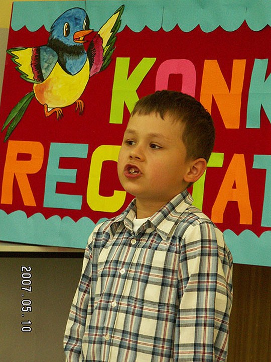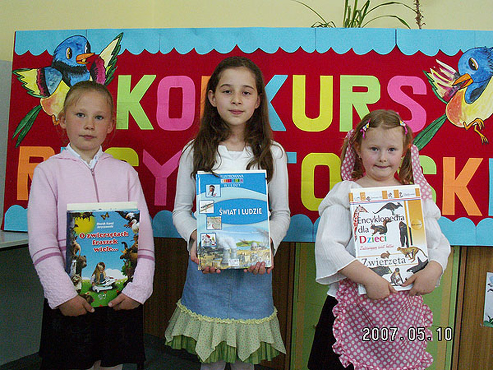W dniu 10 maja 2007 r. w Szkole Podstawowej nr 3 odbył się szkolny konkurs recytatorski „Ptaki, Ptaszki i Ptaszęta Polne”, w którym łącznie zaprezentowało wiersze 64 uczniów z klas I – VI. Dzieci szczególnie z klas młodszych najchętniej, jak zwykle, recytowały wiersze J.Brzechwy i J.Tuwima. Jury, w składzie: A.Bukowska, J.Iwanowska, i K.Tocha, miało niezwykle trudny wybór, jeżeli chodzi o wyłonienie najlepszych recytatorów, gdyż poziom był bardzo wyrównany. W grupie młodszej I miejsce zdobyła Natalia Wierzbicka (klasa III b, II miejsce przypadło Zuzannie Płachta III e, a III- Klaudii Szymczak (I b). W grupie starszej klas miejsce I zdobyła Monika Jastrzębska (VI b), II- Karolina Lewko V a, III- Daria Badyna (IV e). 15 maja w kinie „Bajka” wszystkie uczennice wzięły udział w dalszych eliminacjach, tym razem miejskich. Gratulujemy wszystkim uczestnikom! Organizatorki konkursu: B.Hulewska J.Iwanowska