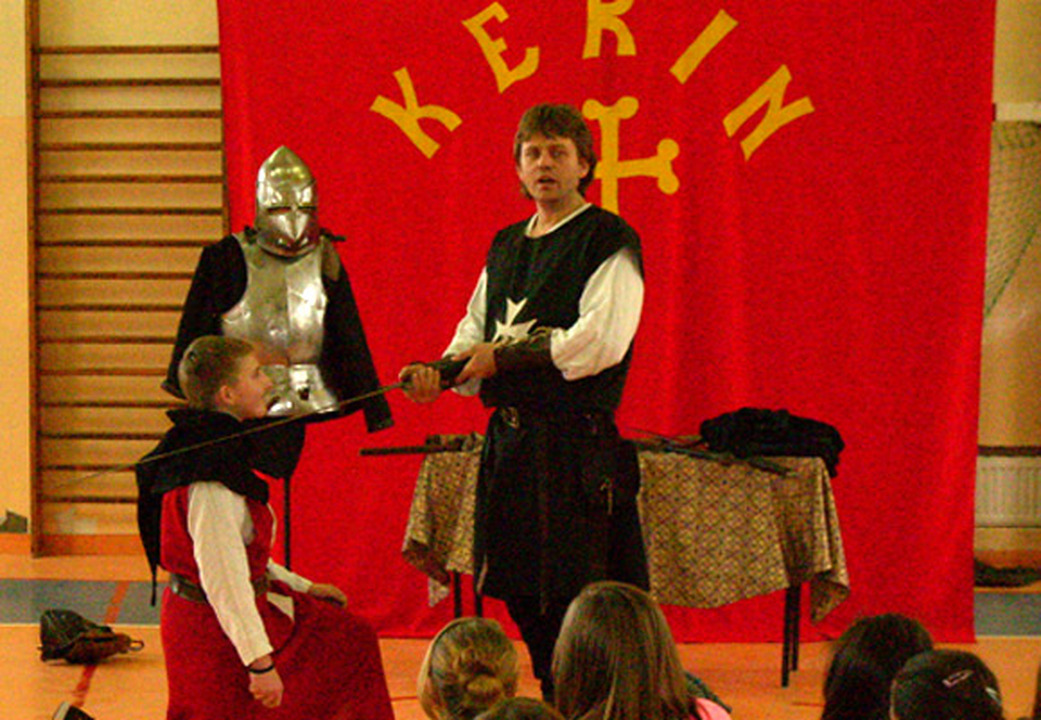 Spotkanie zatytułowane było „Rycerze". W tej żywej lekcji historii udział wzięło około 100 gimnazjalistów, głównie z klas pierwszych. Z zainteresowaniem słuchano opowieści o zwyczajach i tradycjach rycerskich, turniejach, kodeksie rycerza oraz uroczystości pasowania na rycerza. Dużą atrakcją była możliwość obejrzenia miecza, topora, a także przymierzenia kolczugi i zbroi rycerskiej. Najwięcej emocji wzbudził jednak pojedynek, kończący lekcję z Bractwem Kerin, kiedy to z wielkim zaciekawieniem oglądano sypiące się prawdziwe iskry błyskające spod rozgrzanych w walce rycerskich mieczy. Organizatorem spotkania była nauczycielka historii, Justyna Majchrzak.