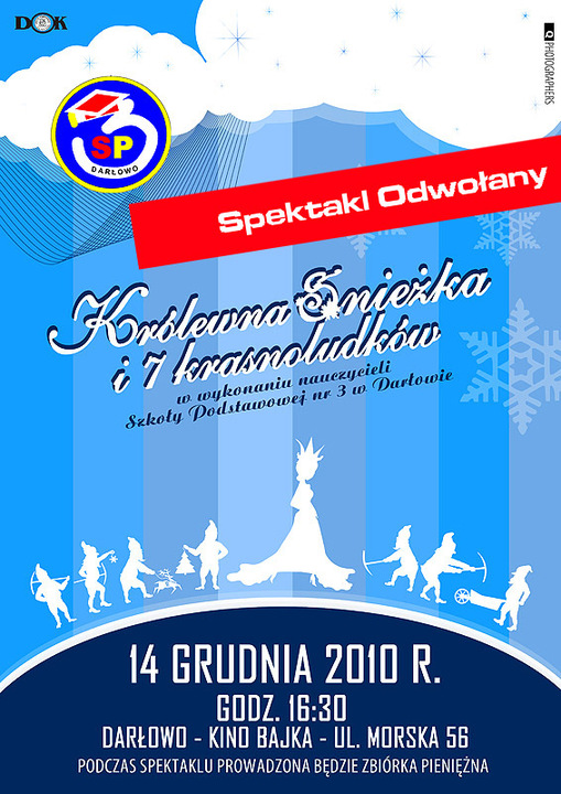 Zaplanowany na 14 grudnia 2010 r.  spektakl pt.: „Królewna Śnieżka i 7 Krasnoludków", w wykonaniu nauczycieli ze Szkoły Podstawowej nr 3 w Darłowie został odwołany.
