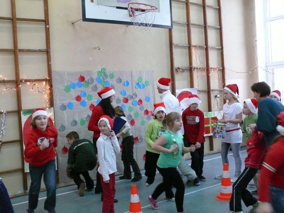 Uczniowie rywalizowali ze sobą w ośmiu konkurencjach sportowych. Wiele emocji dostarczyło „Układanie prezentów Św. Mikołaja" jeden na drugim oraz „Jazda na nartach" z wykorzystaniem kawałków materiałów jako narty i tyczek od stojaków jako kijki. Nie łatwo było „ścigać się w workach" czy pokonywać slalom pająkiem między czapkami Mikołaja. Wszyscy śledzili celność trafień „bombkami" oraz zabawę ze „śnieżnymi kulami". Dużo radości wywołała konkurencja „Renifery Mikołaja", w której jeden z zawodników wcielał się w rolę Mikołaja, a pozostali- jako renifery ciągnęli go w saniach zrobionych z koca. Zmagania sportowe wieńczyła konkurencja „Świąteczny pociąg".