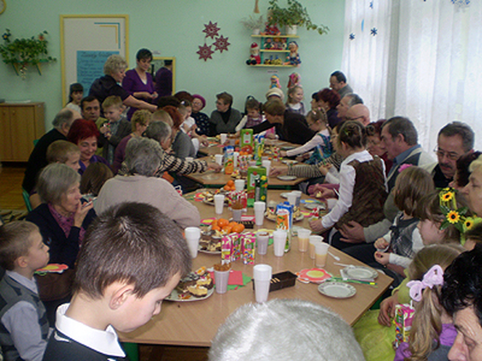 Na koniec dzieci złożyły dziadkom życzenia, zaśpiewały piosenkę „Polka dla Babci i Dziadka". Następnie wnukowie zaprosili Dziadków na salę zabaw, gdzie czekał na nich słodki poczęstunek i prezenty.