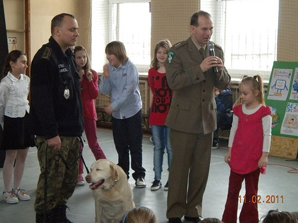Po zakończeniu „rozprawy", odbyła się kolejna część apelu, na którą zaproszono gości specjalnych - przedstawicieli ze Straży Granicznej w Darłowie. Pan Marcin Kruszczyński zaprezentował klasom IV-VI oraz I-III problematykę zagrożeń czyhających podczas zimowych zabaw.  Prosił o rozważne korzystanie z uroków zimy.  Dla uczniów Trójki zaproszeni goście przygotowali także miłą niespodziankę w postaci uroczego labradora, który był nie lada atrakcją dla wszystkich widzów. Panowie poinformowali jak należy zachowywać się w stosunku do nieznanego nam psa. Tu również prosili o ostrożność.