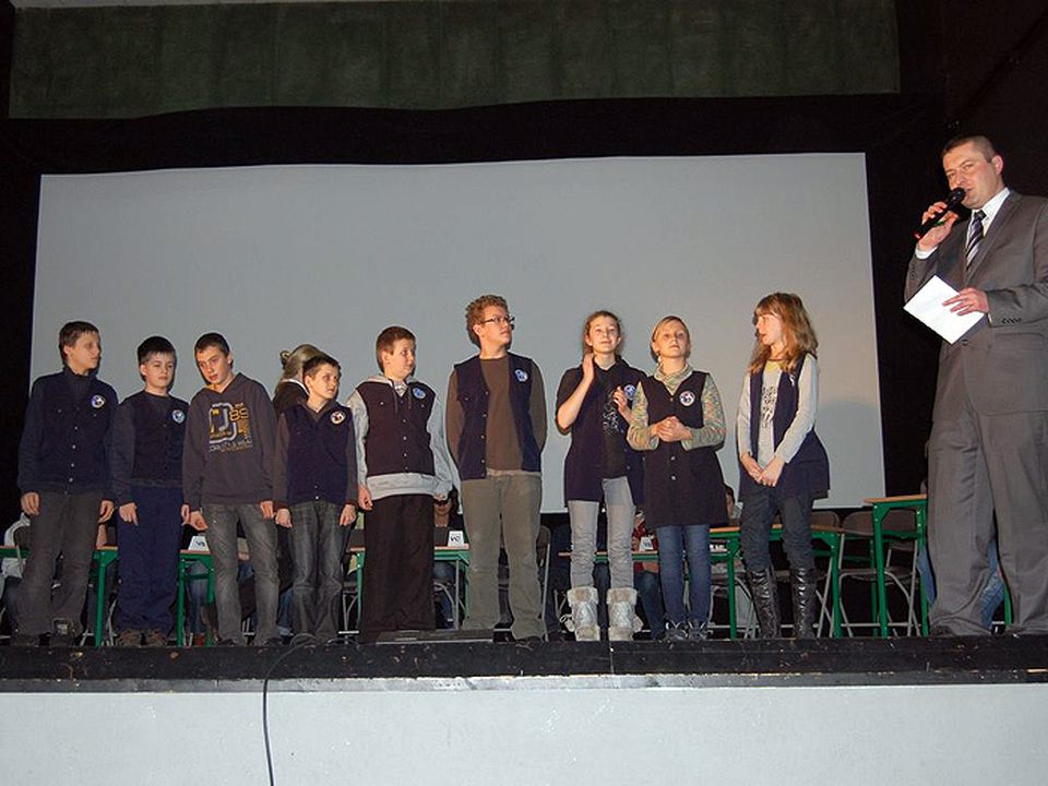 Pomiędzy poszczególnymi częściami turnieju uczniów SP 3 w Darłowie zgromadzonych na widowni zabawiały humorystyczne występy przygotowane przez ich starszych kolegów z Miejskiego Gimnazjum im. Stanisława Dulewicza w Darłowie.