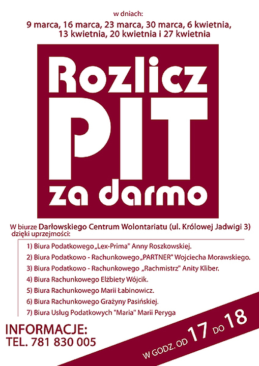 Przypominamy, że dzięki wsparciu darłowskich biur rachunkowych będzie można otrzymać bezpłatną i fachową pomoc przy rozliczeniach podatku dochodowego za rok 2010. Mieszkańcy Darłowa i okolic będą mogli korzystać ze wsparcia specjalistów w każdą środę od godziny 17 do 18 w marcu i kwietniu b.r. w biurze Darłowskiego Centrum Wolontariatu.