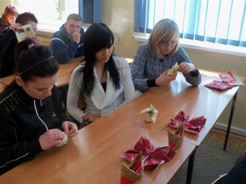 Warsztaty te są kolejnym etapem w prowadzonym wśród szkolnej młodzieży projekcie unijnym Leonardo da Vinci pod nazwą: „Polepszenie szans na rynku pracy w UE". Uczniowie z dużą dozą humoru podeszli do tego zadania. Na początku sceptycznie a później z wielkim zaangażowaniem tworzyli nowe wzory.  Wszystkie wyuczone sposoby składania serwetek i kształtowania nakrycia na stole młodzież wykorzysta w swoich macierzystych zakładach pracy w czasie praktyk zawodowych, u swoich przyszłych pracodawców, ale również przygotowując okazjonalne przyjęcia w swoich własnych domach.
