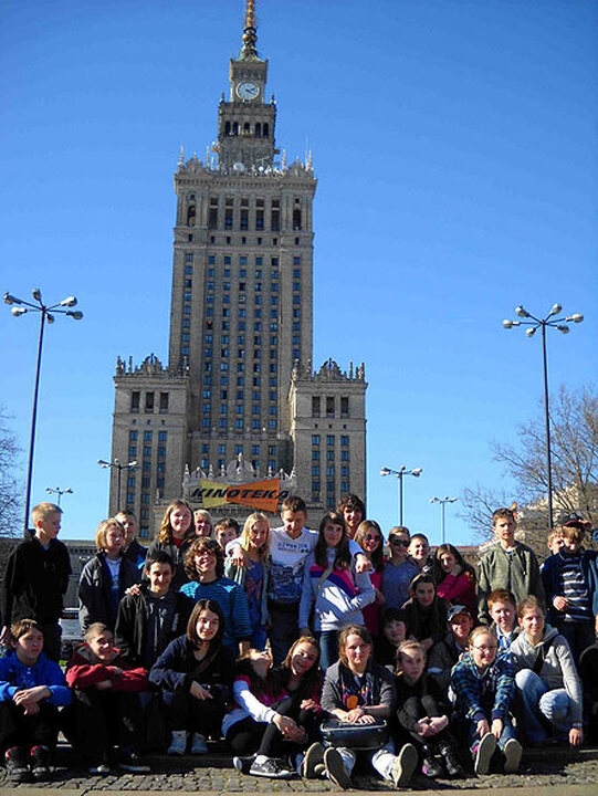 Pierwszą atrakcją, którą obejrzeli uczestnicy wycieczki, był Pałac Kultury i Nauki. Z zaciekawieniem słuchali przewodniczki, która opowiedziała o historii powstania budynku oraz o jego obecnej funkcji. Po wjeździe windą na trzydzieste piętro przed wszystkimi rozpostarł się niesamowity widok . Pogoda była doskonała, więc można było zobaczyć, jak rozległym miastem jest stolica Polski. W ruch poszły aparaty fotograficzne i „komórki". Każdy chciał utrwalić panoramę Warszawy. Młodzi darłowianie obejrzeli również prezentowaną w PKiN wystawę „Człowiek- Ewolucja Niezwykła". Tematyka wystawy obejmowała dzieje ludzkości począwszy od etapów najstarszych, przez osiągnięcia cywilizacyjne ludzi pierwotnych po współczesność, komputeryzację i sztuczną inteligencję.