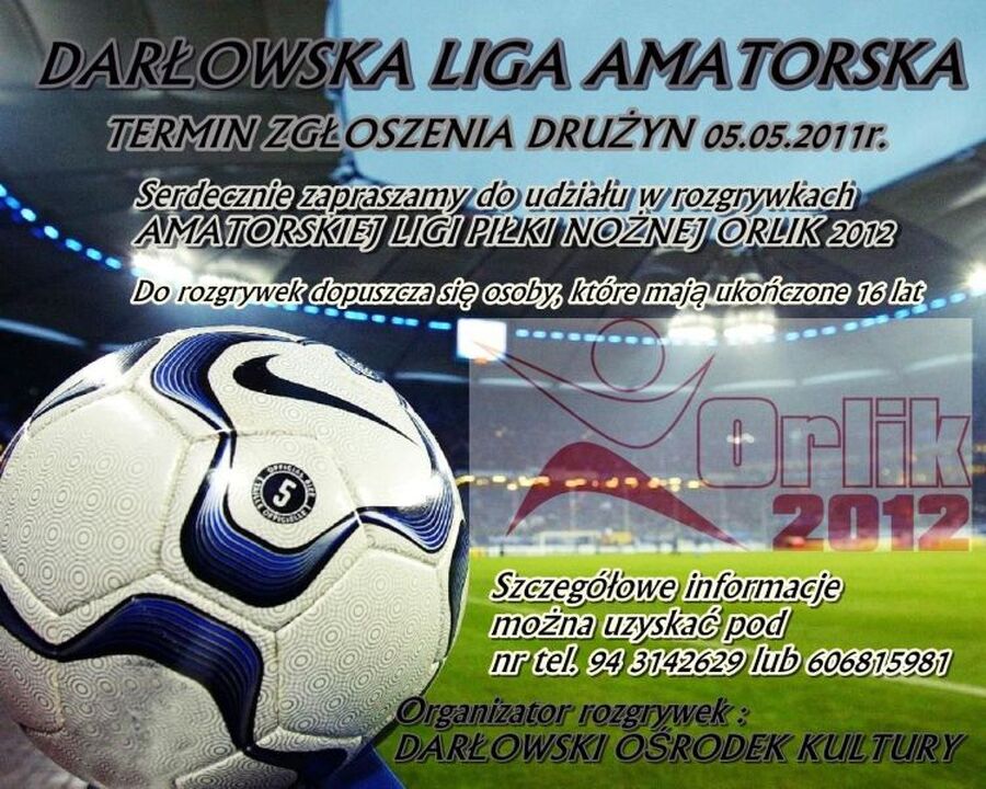 Darłowski Ośrodek Kultury zaprasza wszystkich miłośników piłki nożnej do udziału w Amatorskiej Lidze Piłki Nożnej ORLIK 2012. Do rozgrywek dopuszcza się osoby, które mają ukończone 16 lat.