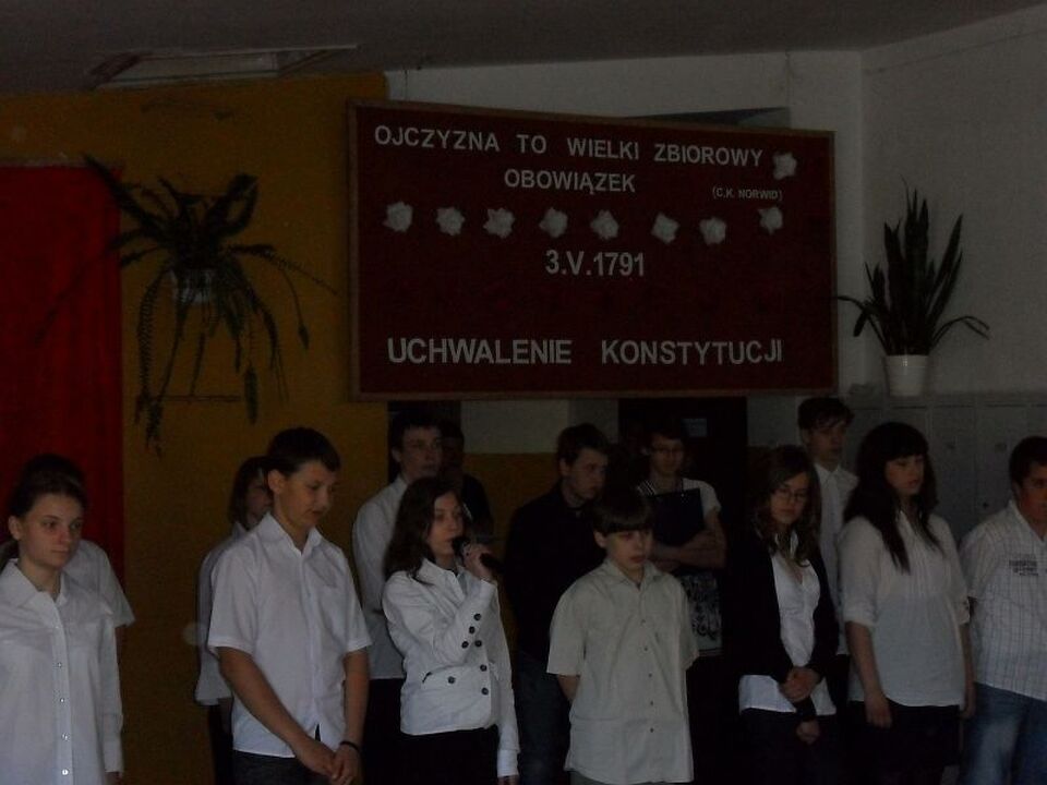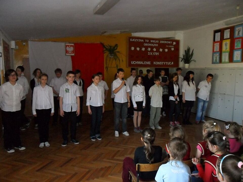 Młodzież przygotowała lekcję historii Polski i przybliżyła całej społeczności szkolnej wiedzę dotyczącą tego ważnego dla naszego narodu wydarzenia, jakim było dzieło Sejmu Czteroletniego - uchwalenie pierwszej w Europie konstytucji. Zarecytowano wiersze i wysłuchano utwory muzyczne oddające charakter myśli politycznej tamtego okresu m.in. Hymn miłości ojczyzny Ignacego Krasickiego: