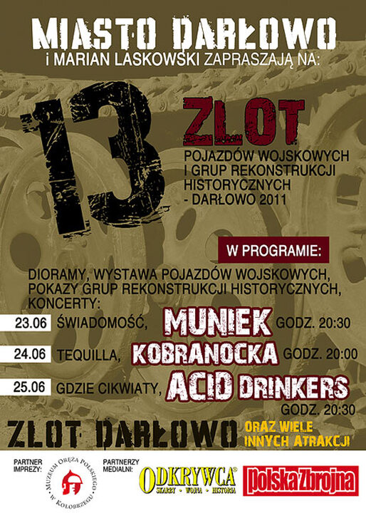 Miasto Darłowo, Marian Laskowski i Muzeum Oręża Polskiego w Kołobrzegu serdecznie zapraszają na Zlot 13 - Zlot Pojazdów Wojskowych i Grup Rekonstrukcji Historycznych, który odbędzie się w Darłowie. Serdecznie zapraszamy w dniach 20 - 26 czerwca 2011 na plac popularnie zwany Patelnią w Darłówku Wschodnim (ul. Słowiańska), gdzie zarówno uczestnicy jak i odwiedzający będą tworzyć największą w Europie imprezę o charakterze militarnym.