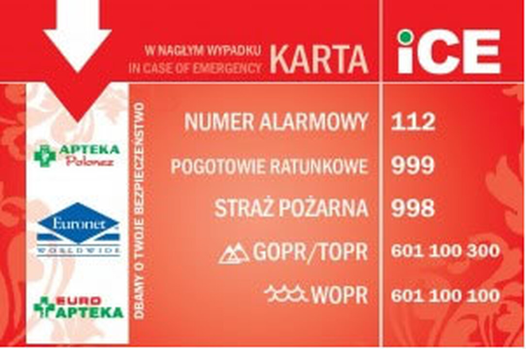 Skrót ICE (In Case of Emergency) oznacza „w nagłym wypadku". Pomysł kart ICE powstał z inicjatywy włoskich ratowników, którzy zauważyli lukę informacyjną w kontakcie z rodziną i bliskimi poszkodowanych. W sytuacji wypadku czy innego zagrożenia nasi bliscy często nie wiedzą, co się wydarzyło i gdzie się znajdujemy. Dlatego warto mieć zapisanych kilka ważnych informacji na karcie ICE. Jest to trwała, plastikowa karta wielkością przypominająca zwykłą kartę płatniczą, z imieniem i nazwiskiem właściciela oraz 3 numerami do naszych najbliższych osób, które należy powiadomić w razie wypadku. Osoby podane do kontaktu powinny umieć udzielić informacji o stanie zdrowia właściciela karty.