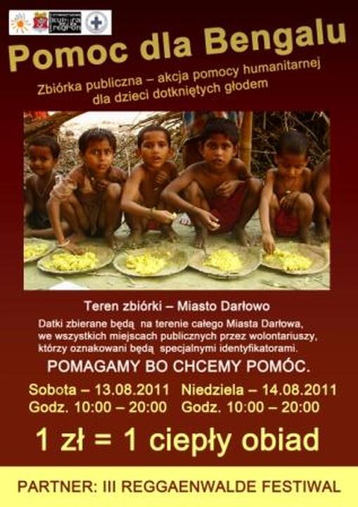 Już w najbliższy weekend tj. 13-14 sierpnia mieszkańcy Darłowa włączą się w humanitarną pomoc dla najmłodszych mieszkańców Bengalu. Będziemy zbierać środki finansowe na ciepły obiad, którego koszt wynosi 1 zł. Pomagamy bo chcemy pomóc! Jeżeli i Ty chcesz się przyłączyć w tą pomoc - zapraszamy. Każda przekazana na ten cel złotówka to jeden ciepły obiad dla Bengalskiego Dziecka.
