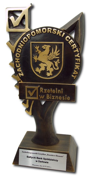 Bałtyki Bank Spółdzielczy w Darłowie jako jeden z dwóch Banków w Polsce i jako jedyny w naszym województwie został uhonorowany Statuetką i Zachodniopomorskim Certyfikatem „RZETELNI W BIZNESIE".