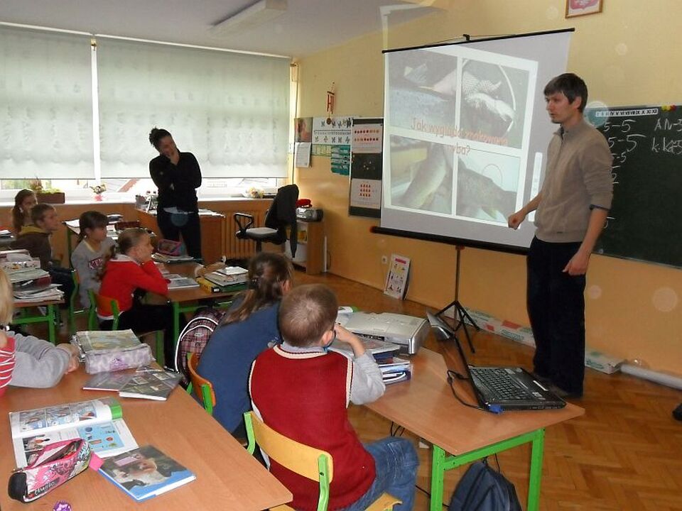 3 listopada 2011 roku gościliśmy w naszej szkole Pana Michała Skórę, który jest pracownikiem Zakładu Ryb Wędrownych przy Instytucie Rybactwa Śródlądowego w Gdańsku. Wszyscy uczniowie szkoły począwszy od pierwszej klasy szkoły podstawowej, a skończywszy na trzeciej klasie gimnazjum wysłuchali interesującego wykładu połączonego z prezentacją multimedialną na temat badań ryb wędrownych, a w szczególności troci i łososi. Uczniowie dowiedzieli się dlaczego i w jaki sposób znakuje się ryby oraz jakie wykorzystuje się w badaniach metody. Podsumowaniem wykładu było ogłoszenie przez prowadzącego dwóch konkursów, skierowanych do wszystkich uczniów. Pierwszy z nich polega na odnalezieniu wśród znajomych wędkarzy lub rybaków znaczków pochodzących od znakowanych ryb przez pracowników Zakładu Ryb Wędrownych. Do znaczka należy dołączyć w miarę możliwości pełny opis złowionej ryby (długość całkowita, masa ryby) i okoliczności połowu (data i miejsce połowu, pozycja geograficzna, łowisko), rodzaj narzędzia połowowego oraz w miarę możliwości łusek w przypadku ryb łososiowatych). Drugi konkurs dotyczy zaprojektowania dowolną techniką plastyczną znaczka służącego do znakowania ryb. Laureatów obu konkursów czekają atrakcyjne nagrody rzeczowe, a rozstrzygnięcie konkursu i wręczenie nagród nastąpi 18 listopada 2011 r. Życzymy wszystkim uczniom powodzenia w obu konkursach!