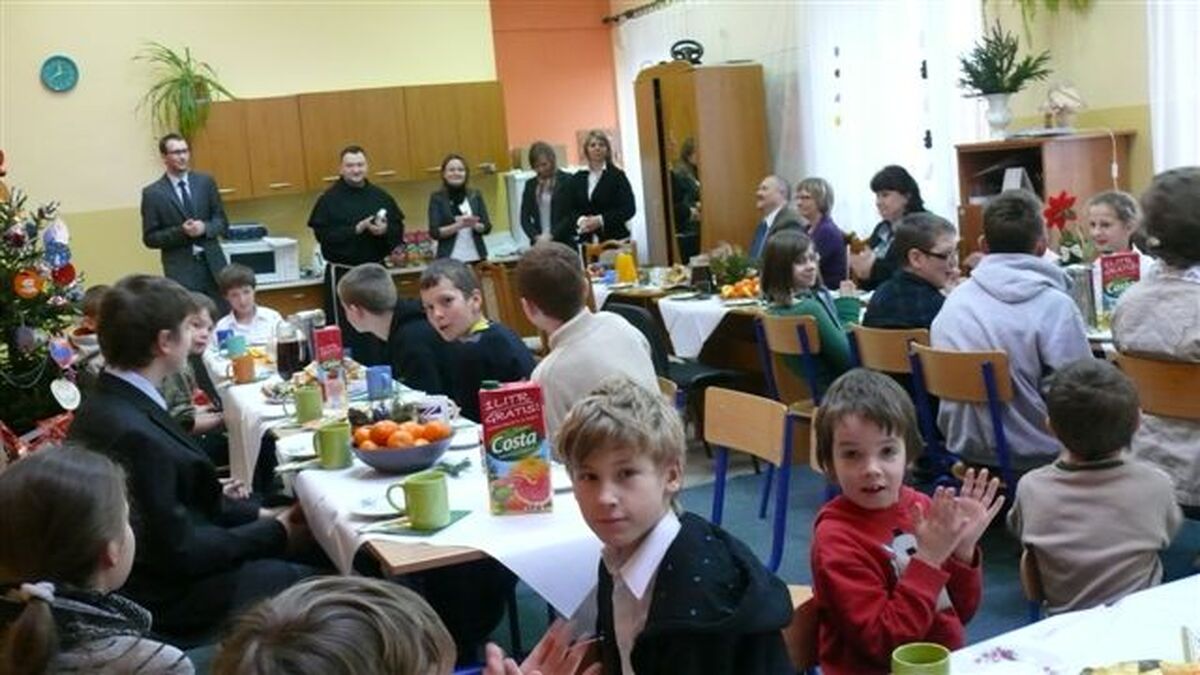 Na początku wigilii Franciszkanin o. Sebastian odczytał fragment ewangelii i przypomniał o Narodzeniu Chrystusa w Betlejemskiej Grocie Pasterzy. Zgodnie z polskim zwyczajem wigilijnym wszyscy łamali się opłatkiem i składali życzenia. Potem śpiewano kolędy i pastorałki przy akompaniamencie Dominiki Lesner i jej gitary. W wigilii oprócz dzieci udział wzięli: Zbigniew Mielczarski - kierownik referatu oświaty i pomocy społecznej w Urzędzie Miejskim, Maria Szafraniec zastępca kierownika Miejskiego Ośrodka Pomocy Społecznej, Arkadiusz Płóciennik - kierownik świetlicy „Bezpieczna Przystań" oraz wychowawcy. Takie spotkania wigilijne dla dzieci organizujemy od kilku lat wyjaśnił Arkadiusz Płóciennik i dodał to już tradycja.