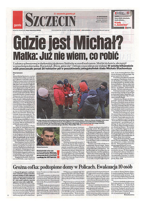 W sobotę 14 stycznia 2012 roku w Darłówku odbyła się kolejna akcja społeczna mająca na celu poszukiwanie zaginionego w noc sylwestrową Michała Stachowicza.