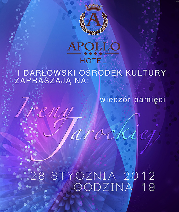 Darłowski Ośrodek Kultury oraz Hotel Apollo serdecznie zapraszają 28 stycznia 2012 roku o godzinie 19 na wieczór poświęcony pamięci Ireny Jarockiej. Odbędzie się on w sali balowej Hotelu Apollo - Darłówko Wschodnie (ul. Kąpielowa 11).