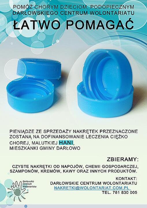 Zapraszamy wszystkich, którzy uzbierali małe i duże worki plastikowych nakrętek oraz tych, którzy chcieliby uzyskać więcej informacji na temat zbiórki, do budynku Miejskiego Zarządu Budynków Komunalnych mieszczącego się przy ulicy 1-go Maja w Darłowie. Celem zbiórki jest pomoc małej Hani - podopiecznej Darłowskiego Centrum Wolontariatu.