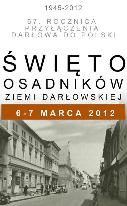 Burmistrz Miasta Darłowa oraz Klub Pionierów Ziemi Darłowskiej zapraszają do udziału w obchodach 67. Rocznicy przyłączenia Darłowa do Polski. Święto Osadników Ziemi Darłowskiej odbędzie się w dniach 6 - 7 marca 2012 roku zgodnie z poniższym harmonogramem: