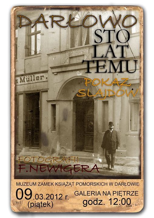 Jerzy Buziałkowski Dyrektor Muzeum Zamek Książąt Pomorskich w Darłowie zaprasza w piątek 9 marca 2012 roku o godzinie 12 na niezwykłą podróż w czasie - pokaz slajdów i fotografii F. Newigera z początku XX wieku.  Niepowtarzalne obrazy ukazujące „Darłowo 100 lat temu" prezentowane będą w Galerii Na Piętrze darłowskiego Zamku. Polecamy.