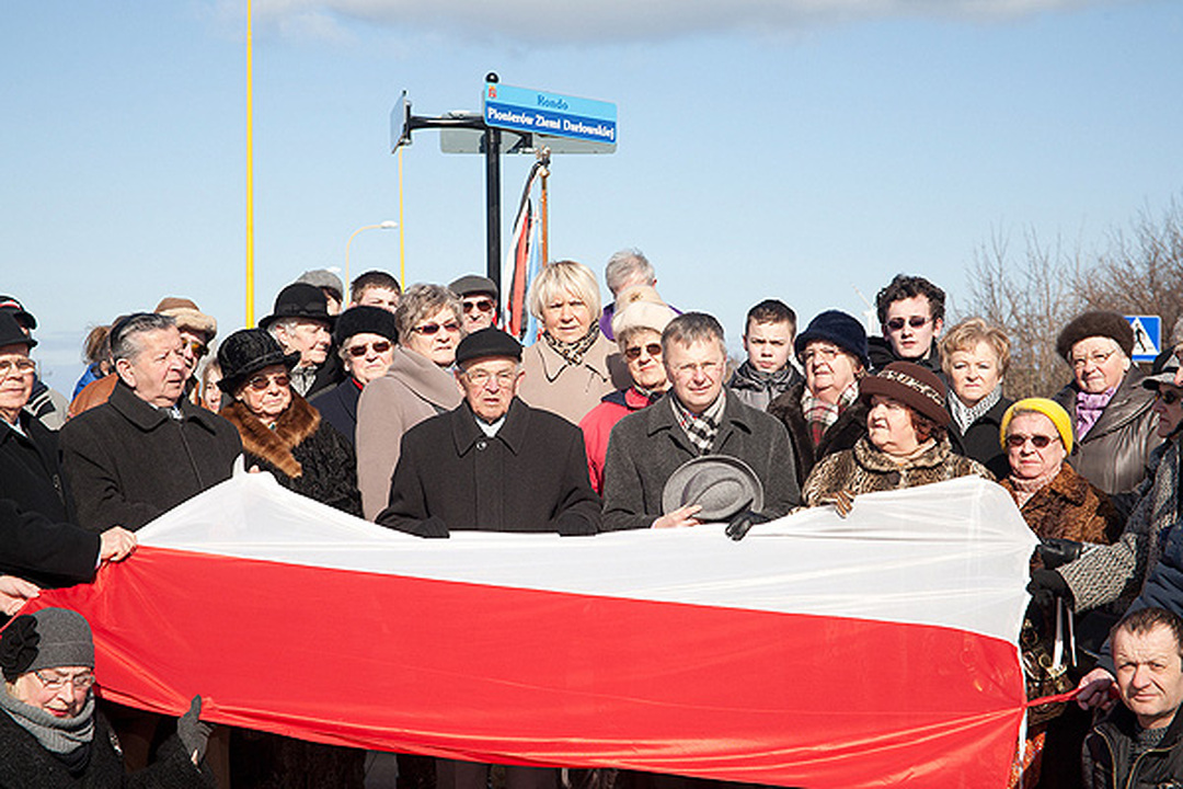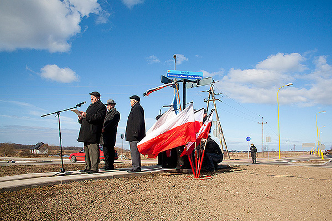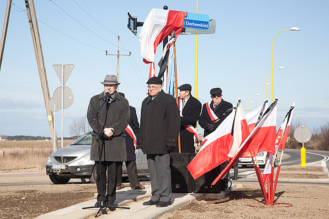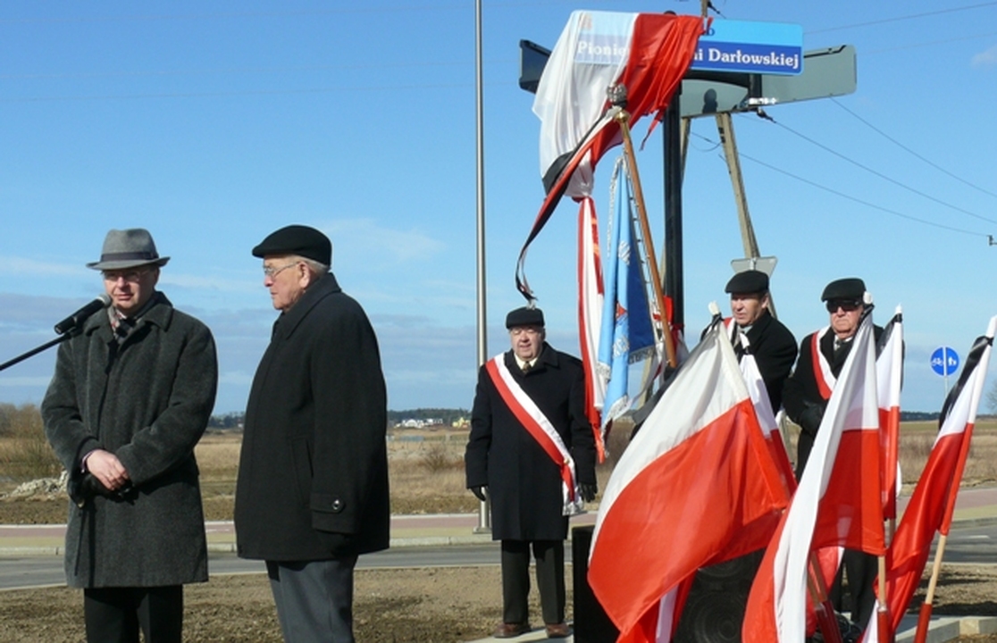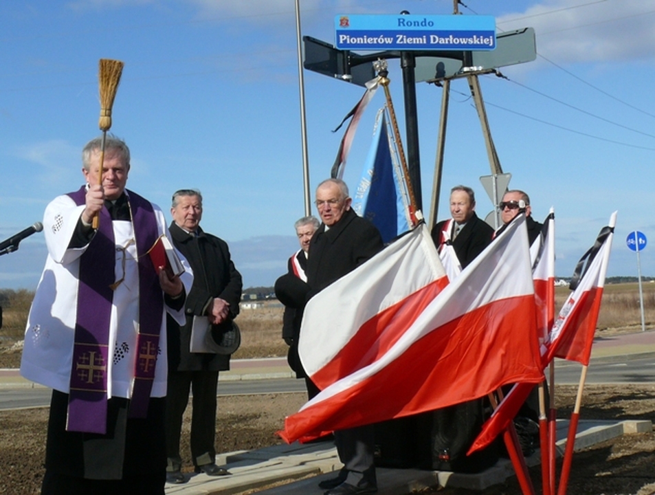 Na otwarcie i nadanie imienia rondu przybyli: Poczet Sztandarowy Klubu Pionierów Ziemi Darłowskiej, Arkadiusz Klimowicz – burmistrz miasta Darłowo, Zbigniew Grosz – przewodniczący Rady Miejskiej, proboszczowie parafii Św. Gertrudy ks. Eugeniusz Gnibba i M.B. Częstochowskiej o Stanisław Piankowski, dowódca Placówki Straży Granicznej mjr Mikołaj Kaczanowicz, liczni Pionierzy oraz młodzież Miejskiego Gimnazjum im. S. Dulewicza. Burmistrz miasta podkreślił zasługi i wkład pierwszych powojennych mieszkańców Darłowa w rozwój miasta. Obecne władze samorządowe kontynuują dobre tradycje rozpoczęte przez przybyłych tu osadników z różnych stron naszej Ojczyzny. Prezes Klubu Pionierów Eugeniusz Wójcik serdecznie dziękował władzom samorządowym za upamiętnienie Pionierów Ziemi Darłowskiej rondem. Odsłonięcia tablic z nazwą ronda dokonał pomorski nadmorski wiatr. Rondo poświęcił proboszcz parafii Św. Gertrudy Eugeniusz Gnibba. Dalsze rocznicowe uroczystości związane z powrotem Darłowa do Polski odbędą się nazajutrz.