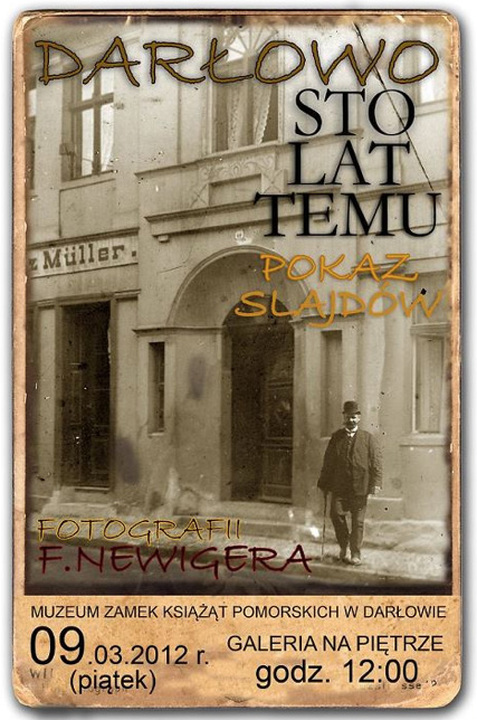 Jerzy Buziałkowski Dyrektor Muzeum Zamek Książąt Pomorskich w Darłowie zaprasza w piątek 9 marca 2012 roku o godzinie 12 na niezwykłą podróż w czasie - pokaz slajdów i fotografii F. Newigera z początku XX wieku. Niepowtarzalne obrazy ukazujące „Darłowo 100 lat temu" prezentowane będą w Galerii Na Piętrze darłowskiego Zamku. Polecamy.