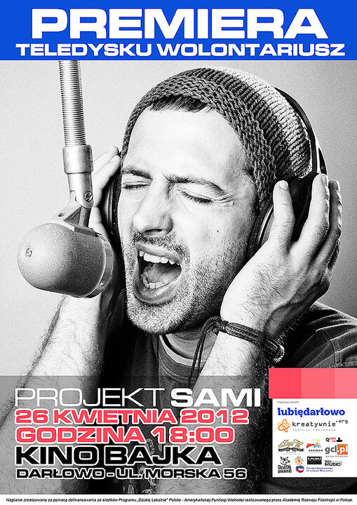 Zapraszamy na oficjalną PREMIERĘ Teledysku Wolontariusz do muzyki zespołu SAMI. 26 kwietnia 2012 - godzina 18:00, Kino Bajka Darłowo (ul. Morska 56). Jeden cel, 300 wolontariuszy - tego nie możesz przegapić. Darłowskiemu Ośrodkowi Kultury - serdecznie dziękujemy za bezcenną pomoc i nieodpłatne udostępnienie KINA:) Musicie to zobaczyć - bądźcie z nami - Wolontariuszami Darłowskiego Centrum Wolontariatu.