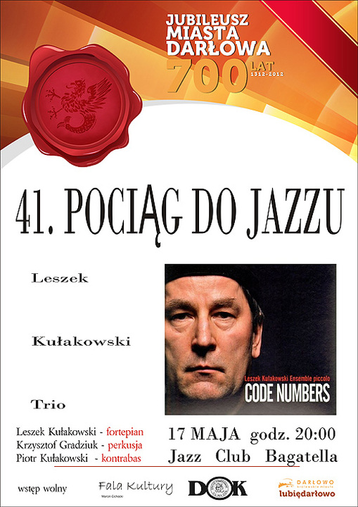 O godzinie 20:00 41. Pociąg do Jazzu. W ramach tej muzycznej uczty posłuchamy specjalnie na tą okazję sprowadzonego fortepianu, na którym zagra Leszek Kułakowski. Koncert wyjątkowy i co ciekawe darmowy, a to za sprawą Władz Miasta oraz Darłowskiego Ośrodka Kultury. Leszek Kułakowski zaprezentuje utwory z najnowszej płyty "Code Numbers" bardzo dobrze przyjętej przez krytyków (m.in. "Płyta Dużego Formatu" Gazety Wyborczej). Kompozytor i pianista przekonuje, że żyjemy w świecie numerów, bo mamy PESEL-e, PIN-y, wszystko ma kody cyfrowe, sama muzyka jest matematyką, można wszystko w niej wyliczyć. Pod tymi numerami są emocje, uczucia, szczęście i cierpienie, są ludzie. I w mojej muzyce, pod numerami, kryje się to wszystko. To bardzo emocjonalna płyta, są na niej utwory energetyczne, dynamiczne, ale i nostalgiczne, liryczne". Część krytyków słyszy w muzyce "Code Numbers" skandynawską melancholię. Sam artysta nazywa ją bałtycką i kaszubską. Zamiast tytułów, utwory mają kody. Na przykład pod solowym utworem fortepianowym "66665" kryje się melancholijna opowieść inspirowana morzem, którego odgłosy słychać w tle. Muzycy zagrają w składzie: Leszek Kułakowski - lider, fortepian Krzysztof Gradziuk - perkusja Piotr Kułakowski - kontrabas.