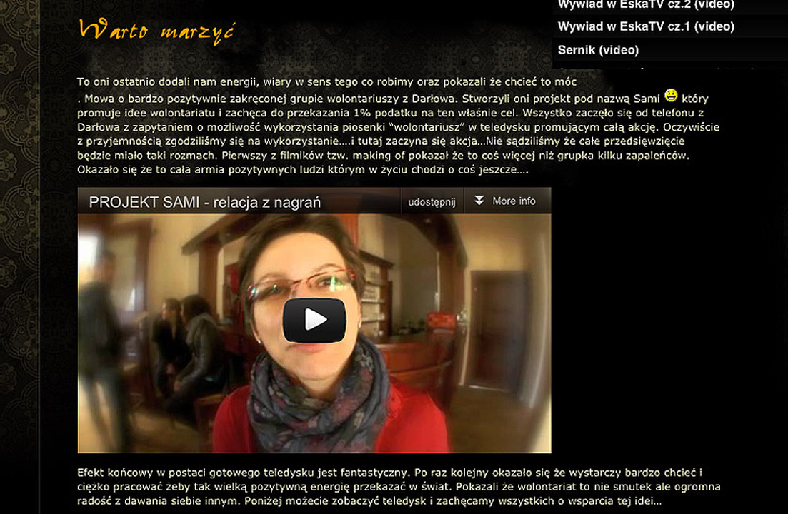 . Mowa o bardzo pozytywnie zakręconej grupie wolontariuszy z Darłowa. Stworzyli oni projekt pod nazwą Sami który promuje idee wolontariatu i zachęca do przekazania 1% podatku na ten właśnie cel. Wszystko zaczęło się od telefonu z Darłowa z zapytaniem o możliwość wykorzystania piosenki "wolontariusz" w teledysku promującym całą akcję. Oczywiście z przyjemnością zgodziliśmy się na wykorzystanie....i tutaj zaczyna się akcja...Nie sądziliśmy że całe przedsięwzięcie będzie miało taki rozmach. Pierwszy z filmików tzw. making of pokazał że to coś więcej niż grupka kilku zapaleńców. Okazało się że to cała armia pozytywnych ludzi którym w życiu chodzi o coś jeszcze....