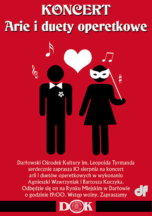 W dniu dzisiejszym (tj. 10 sierpnia) na Rynku Miejskim w Darłowie usłyszymy najpiękniejsze arie i duety operetkowe. Uczta dla melomanów rozpocznie się o godzinie 19:00. Podczas koncertu zaśpiewają Agnieszka Wawrzyniak oraz Bartosz Kuczyk, którzy wielokrotnie gościli w Darłowie. Wstęp wolny - zapraszamy.