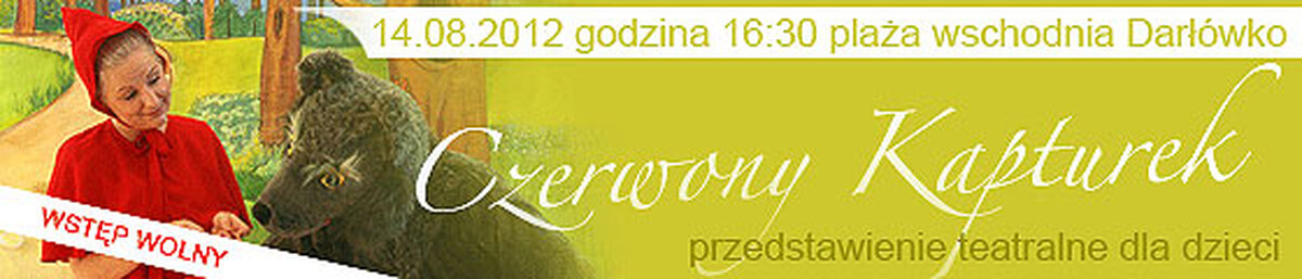 Wszystkie dzieci wraz z rodzicami, we wtorek 14 sierpnia serdecznie zapraszamy do Darłówka Wschodniego na letni spektakl teatralny dla dzieci pt.: Czerwony Kapturek. Znana bajka Braci Grimm zaprezentowana zostanie przez Studio Rozrywkowo-Teatralne DUET z Krakowa. Bajka rozpocznie się o godzinie 16:30 na plaży wschodniej obok Hotelu Apollo. Wstęp bezpłatny.