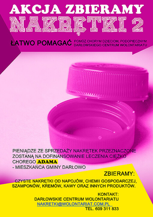 Po udanej pierwszej akcji zbierania plastikowych nakrętek na rzecz chorej Hani, wolontariusze z Darłowskiego Centrum Wolontariatu rozpoczęli drugą - pod nazwą: Nakrętki 2. Tym razem pomogą potrzebującemu, choremu mieszkańcowi gminy Darłowo - Adamowi.