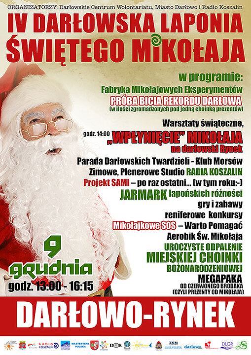 Już w najbliższą niedzielę (tj. 9 grudnia 2012) zapraszamy serdecznie wszystkie dzieci oraz całe rodziny z Darłowa, mieszkańców Powiatu Sławieńskiego, wszystkich turystów wypoczywających w naszym regionie  do udziału w największym przedświątecznym, wydarzeniu - IV Darłowskiej Laponii Świętego Mikołaja. Odbędzie się ona na rynku miejskim w Darłowie w godzinach 13:00 - 16:15. W programie imprezy poza stałymi elementami pojawią się również nowości: Fabryka Mikołajowych Eksperymentów, próba bicia rekordu Darłowa (w ilości zgromadzonych pod jedną choinką prezentów), „Wpłynięcie" Mikołaja na darłowski Rynek (ok. godz. 14:00), parada Darłowskich Twardzieli (klub morsów), zimowe, plenerowe Studio Radia Koszalin (z relacjami na żywo z darłowskiego rynku),  Projekt SAMI - po raz ostatni... (w tym roku:-), jarmark lapońskich różności, gry i zabawy, reniferowe  konkursy, Mikołajkowe SOS - warto pomagać,  aerobik Św. Mikołaja, MegaPaka od Czerwonego Brodaka (czyli prezenty od Mikołaja).