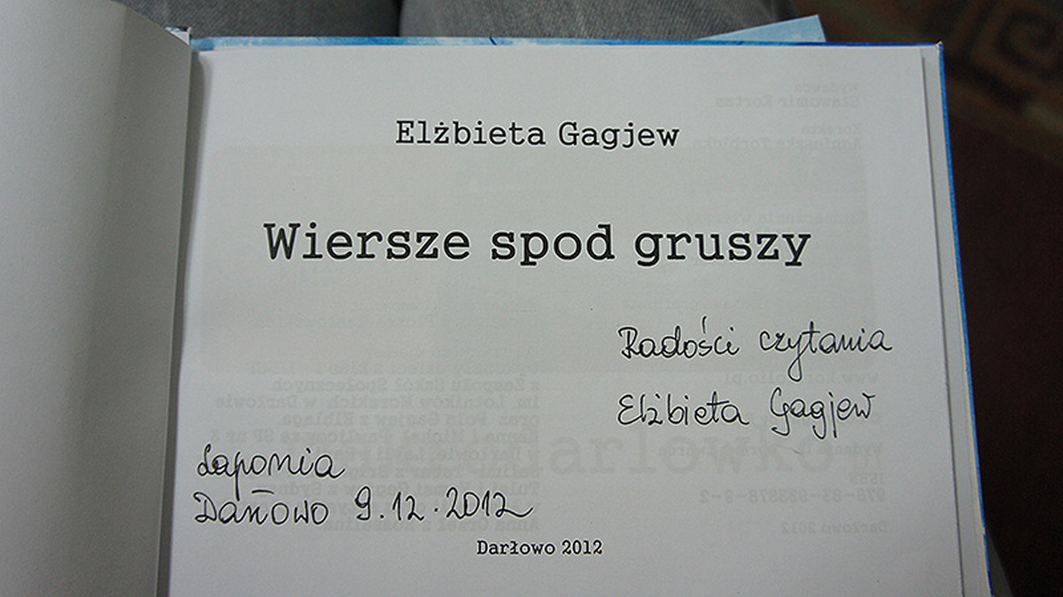 W dniu dzisiejszym o godzinie 17:00 w Bibliotece Publicznej im. A. Osieckiej w Darłowie odbyło się spotkanie z Elżbietą Gagjew - autorką tomiku wierszy dla dzieci „Wiersze spod gruszy". Podczas spotkania E. Gagjew opowiadała o kulisach powstawania publikacji, osobiście odczytała kilka wybranych wierszy. Niektóre z nich przedstawili również uczniowie miejskiego gimnazjum im. S. Dulewicza, przygotowani przez nauczycielkę języka polskiego - Ewę Majdańską. Niezwykle miłym gestem było przekazanie tomików dyrektorom darłowskich szkół i przedszkoli na stan bibliotek placówek przez nich prowadzonych. Autorka przekazała również kilka egzemplarzy z dedykacją na potrzeby organizacji największych mikołajek w regionie - IV Darłowskiej Laponii Świętego Mikołaja - do kogo trafią? O tym zadecyduje Mikołaj.
