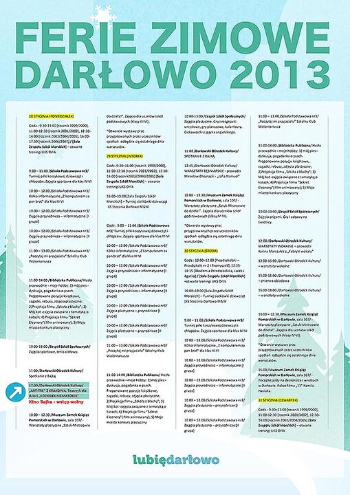 Jak co roku darłowskie placówki oświatowe oraz instytucje kulturalne przygotowały programy dodatkowych zajęć, z których wszystkie dzieci będą mogły skorzystać nieodpłatnie. Uruchomione lodowisko miejskie w okresie ferii zimowych  będzie funkcjonowało każdego dnia w godzinach od 10:00 do 20:00. Zarówno dla młodzieży szkolnej jak i dzieci z darłowskich szkół i przedszkoli - wstęp na nie będzie bezpłatny. Dwukrotnie na scenach darłowskiego Kina Bajka odbędzie się teatrzyk dla dzieci. 28 stycznia i 5 lutego o godzinie 17:00 spotkamy się z aktorami ze Studia Małych Form Teatralnych z Krakowa w spektaklach: „Koziołek Niematołek" oraz „Kwiat Paproci".  Nie zabraknie zajęć sportowych, które odbywać się będą w darłowskich szkołach oraz na sali gimnastycznej Zespołu Szkół Morskich w Darłowie.  Ciekawą ofertę przygotowało Muzeum Zamek Książąt Pomorskich. Warsztaty plastyczne, fotograficzne, próba budowy darłowskiego Zamku, prelekcja filmu ukazująca początki jazdy na deskorolce i wrotkach w Darłowie pokazana z perspektywy krawężnika w kadrach Kamila Hasiuka - to tylko część bogatego zestawu propozycji.