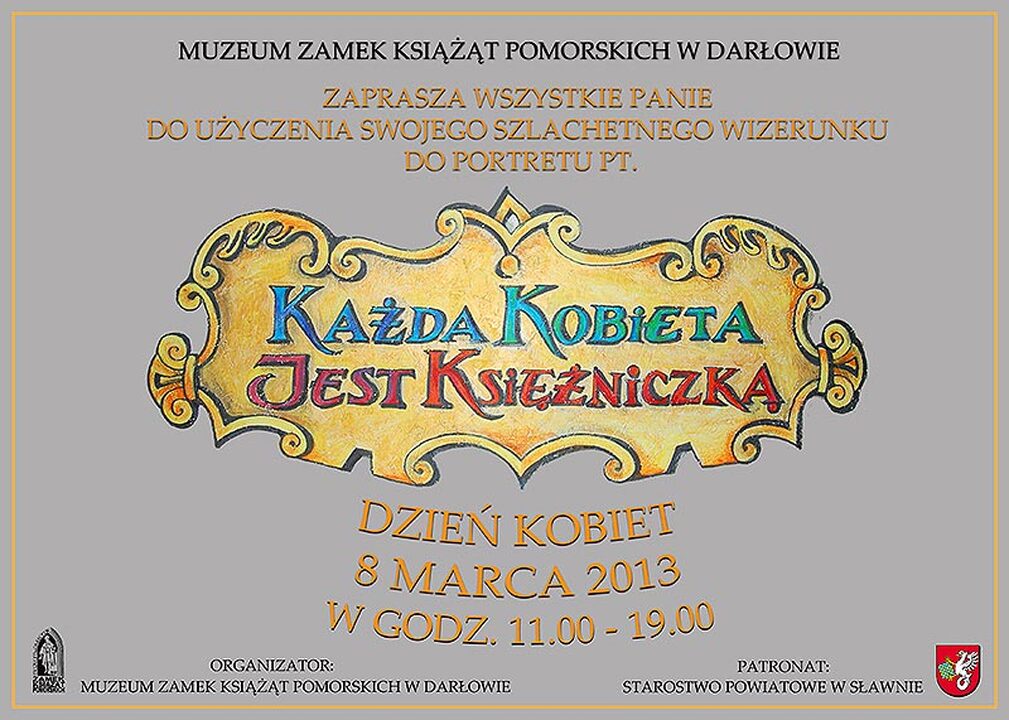 Muzeum Zamek Książąt Pomorskich w Darłowie zaprasza wszystkie Panie do użyczenia swojego szlachetnego wizerunku do portretu pt.: „Każda Kobieta jest Księżniczką". Akcja zorganizowana zostanie w godzinach 11:00 - 19:00 z okazji przypadającego 8 marca „Dnia Kobiet" w darłowskim Zamku (ul. Zamkowa 4).  Impreza zorganizowana pod patronatem Starostwa Powiatowego w Sławnie przez Muzeum Zamek Książąt Pomorskich w Darłowie. Zapraszamy serdecznie.
