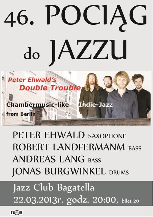 Na europejskiej trasie Peter Ehwald's Double Trouble, będzie to jedyny występ w naszym kraju, zarazem to 46 koncert, trwającego już ponad 6 lat zjawiskowego cyklu Pociąg do Jazzu, prezentującego muzykę improwizowaną i jazzową na najwyższym europejskim i światowym poziomie. Jazz to muzyka bezpośredniego doświadczenia, kontaktu z publicznością, również a może przede wszystkim z niego budująca swój efemeryczny urok, wszystkich serdecznie zapraszamy.
