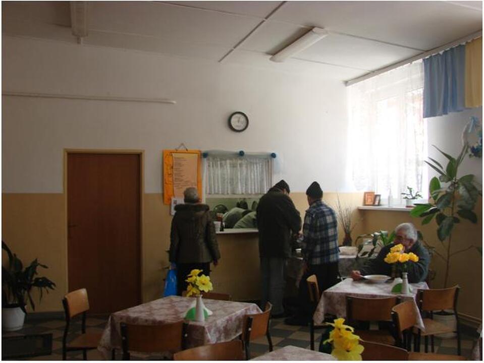 Wydawanie posiłków zaczyna się zaraz po dziesiątej, ale drzwi uchylą się również wcześniej. Za nimi jest sala, wewnątrz jednorazowo zmieści się ponad 40 osób. Kilka stołów i krzesła do siedzenia. I jedno okienko. Przy okienku tym Pani Teresa na przemian z Panem Sławkiem nalewają gorącą zupę po same brzegi wazy, gorącą i gęstą, człowiek może się ogrzać i nasycić tą zupą, nasycić ciało i serce, bo przecież ktoś jednak o nim pomyślał, ktoś zadbał. Obok okienka znajduje się stolik gdzie można pobrać kromki chleba, ale bywały też dni gdzie cały bochenek chleba dostanie się w dłonie,a nawet coś słodkiego.