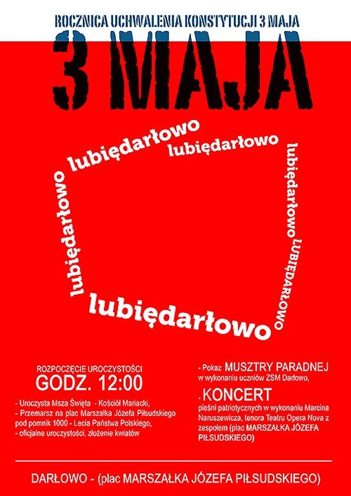 Dziś Rocznica Uchwalenia Konstytucji 3 Maja. Serdecznie zapraszamy do wspólnego świętowania. Oficjalne uroczystości rozpoczną się o godzinie 12:00 Mszą Świętą w Kościele Mariackim. Po niej, przemaszerujemy na Plac Marszałka Józefa Piłsudskiego, gdzie po oficjalnych przemówieniach, Salwie Honorowej - wystąpi po raz pierwszy w Darłowie - Zespół Szkół Morskich w Pokazie Musztry Paradnej. Na zakończenie coś dla ucha w narodowym klimacie - Koncert Pieśni Patriotycznych w wykonaniu tenora Teatru Opera Nova z Bydgoszczy Marcina Naruszewicza z zespołem. Zapraszamy.