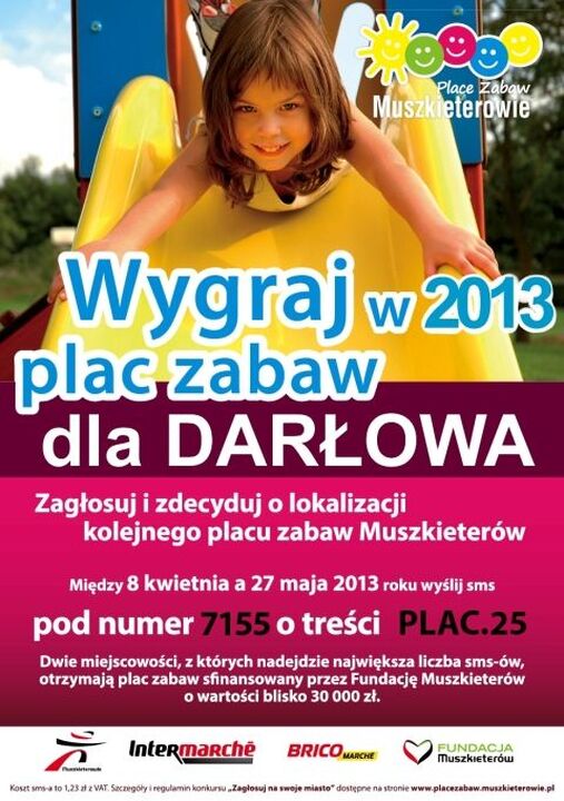 W ramach plebiscytu „Zagłosuj na swoje miasto", mieszkańcy Darłowa mogą wysyłać SMS o treści PLAC.25 pod numer 7155. Koszt SMS to 1 złoty plus VAT. W dwóch miejscowościach, na które zostanie oddana największa liczba głosów, Fundacja Muszkieterów ufunduje nowoczesne, kolorowe i bezpieczne place zabaw, każdy o wartości blisko 30 tys. zł.Ogłoszenie zwycięskich miast nastąpi tego samego dnia o godz. 15, a wyniki zamieszczone zostaną w Aktualnościach na stronie internetowej konkursu:www.placezabaw.muszkieterowie.pl. Tam też można znaleźć szczegółowe informacje o zasadach głosowania oraz regulamin konkursu.Zachęcamy mieszkańców Darłowa do przyłączenia się do zabawy i oddawania głosów na swoje miasto.