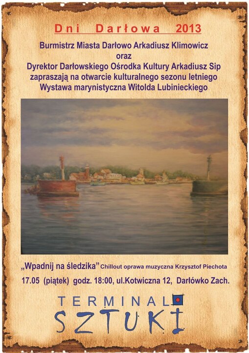 Mieszkańców Darłowa, regionu oraz turystów zapraszamy w piątek 17 maja o godz. 18:00 do Terminala Sztuki, w Darłówku Zachodnim przy ul. Kotwicznej 12. Tam w iście morskim klimacie rozpoczniemy obchody tegorocznych DNI DARŁOWA, zaingurujemy Kulturalny Sezon Letni, a także otworzymy wystawę marynistyczną Witolda Lubinieckiego, znanego i szanowanego malarza-marynisty, którego prace były i są popularne w kraju i poza granicami Polski.